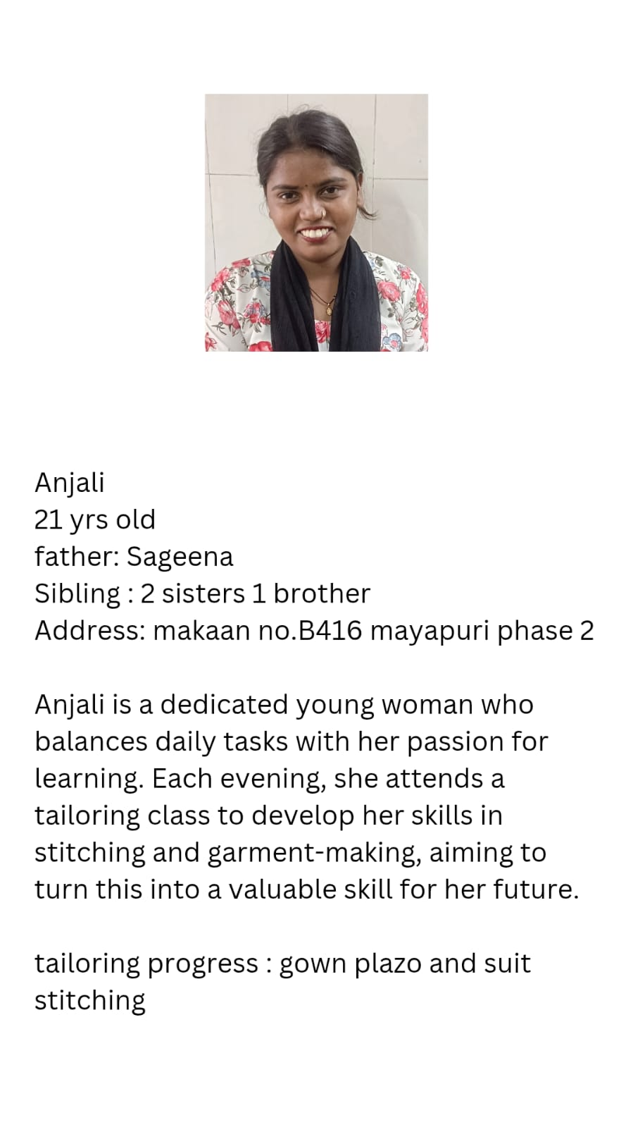 Name: Laxmi Age: 18 Address: B 931 mayapuri phase 2 railway line Family: Mother: Pinki Devi Father: Birbal Mahto Siblings: Two sisters and one brother High School: Recently completed schooling Current and Future Plans: Skill Development: Laxmi is pursuing tailoring skills and plans to expand her expertise into beauty and parlour services. Future Aspirations: She aims to establish her own tailoring and beauty parlour business. Daily Routine: Household Responsibilities: Laxmi assists with chores and family care, sharing duties with her siblings. Skill Training: She engages in tailoring classes to improve her skills. Community Engagement: Laxmi actively participates in local events, fostering connections within her community. tailoring: blouse cutting, suit and petticoat
